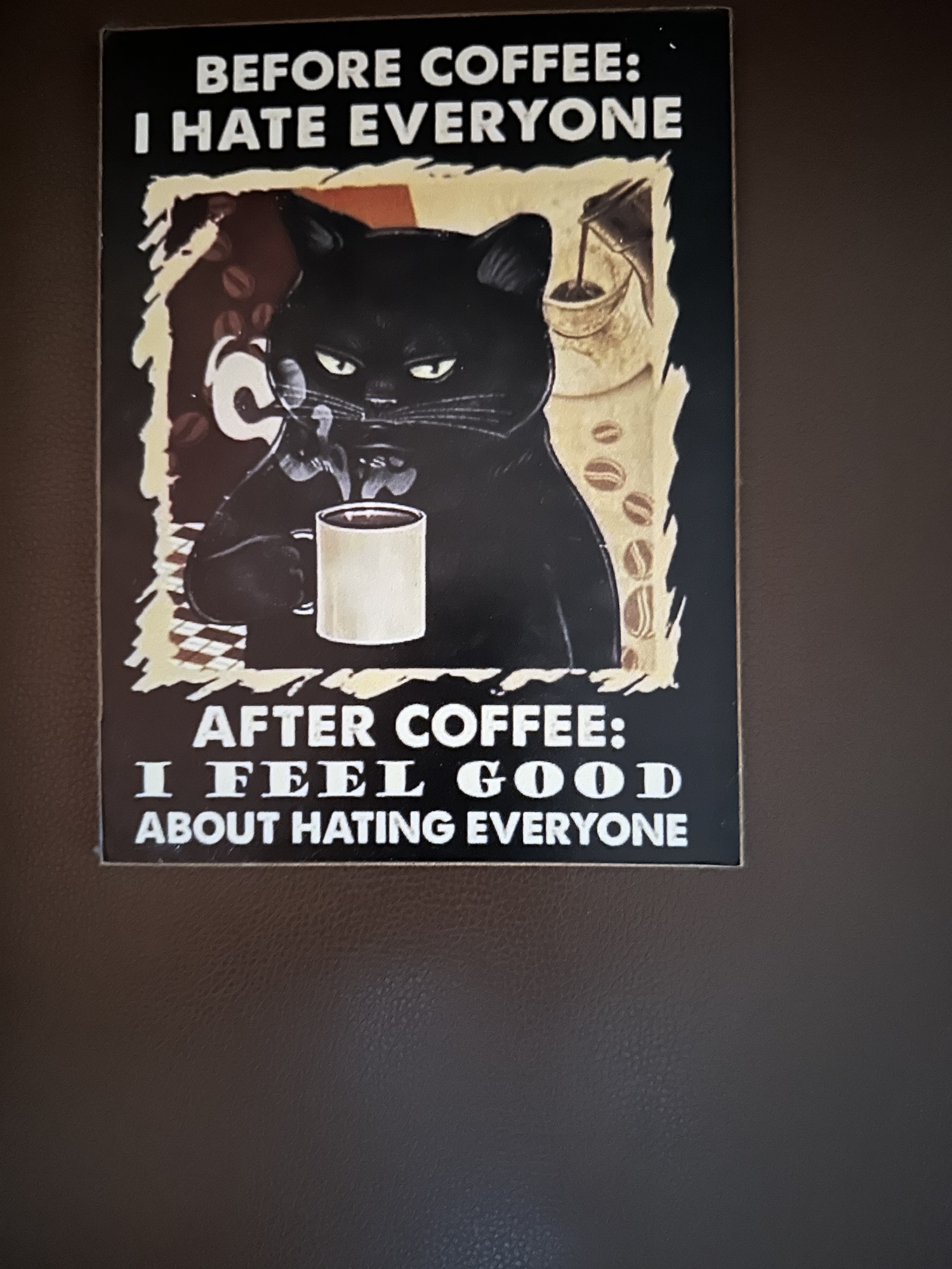 While wandering around the cobbled mediaeval alleys of one European old town full of insouciant cats, I saw a cat poster in a little shop that said: “Before Coffee : I hate everyone. After Coffee : I feel good about hating everyone.”